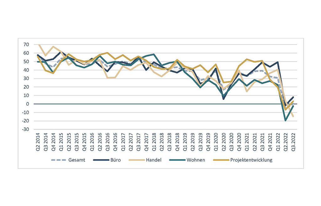 Bereits im Vorquartal sank das Immobilienklima zum ersten Mal ins Negative (im Vergleich zum Vorquartal von 30,7 auf -5,5). Damit bestätigte sich bereits im Sommer, dass es um die Stimmung in den Führungsetagen der deutschen Immobilienunternehmen deutlich schlechter stand als zu den Hochzeiten der Corona-Pandemie. Während in dieser Zeit Betongold als krisensichere Währung galt, fürchten derzeit viele Marktbeteiligten die Folgen der Inflation, steigenden Zinsen und der Vorfinanzierung steigender Energiepreise.